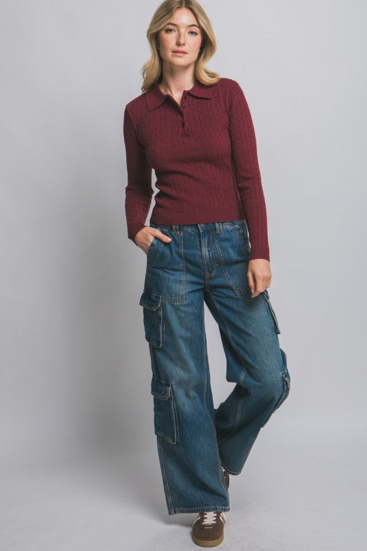 Stay cozy and stylish in this Cable Knit Polo Sweater Top! Featuring a classic collar and button plaque with charming cable pattern details, it’s perfect for layering or wearing solo. The long sleeves and relaxed fit offer comfort without sacrificing flair, making it your go-to for those cool days when you want to feel snug and look sharp. Whether paired with jeans or skirts, this sweater adds a playful twist to your everyday wardrobe.