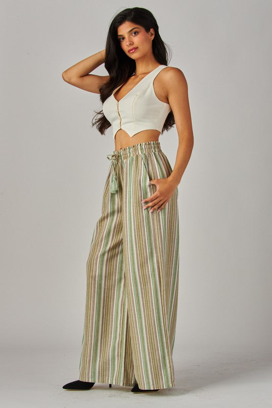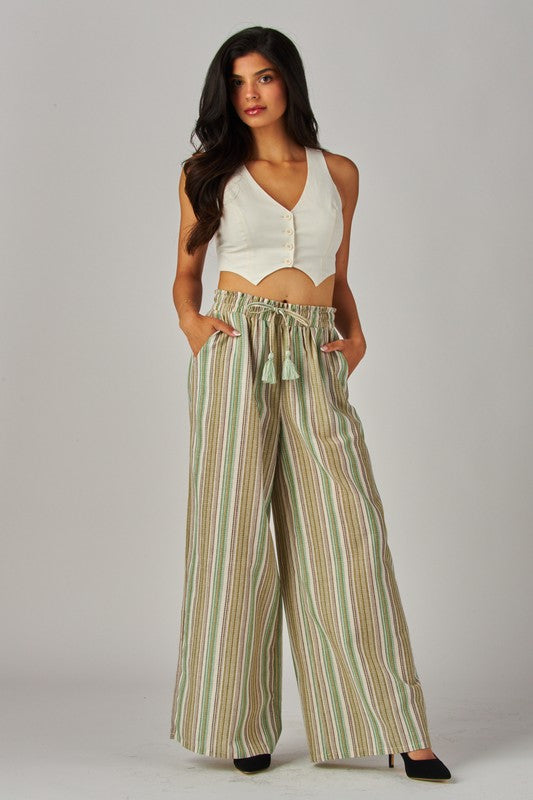 Get ready to turn heads with these playful Bohemian striped trousers! Made from lightweight cotton, they keep you cool and comfy all day. The adjustable elastic waist with a fun pompon drawcord adds a charming touch, while slit pockets offer handy storage. Perfect for beach days or casual outings, these pants bring effortless style and a splash of whimsy to your wardrobe.