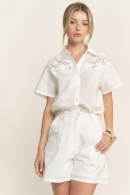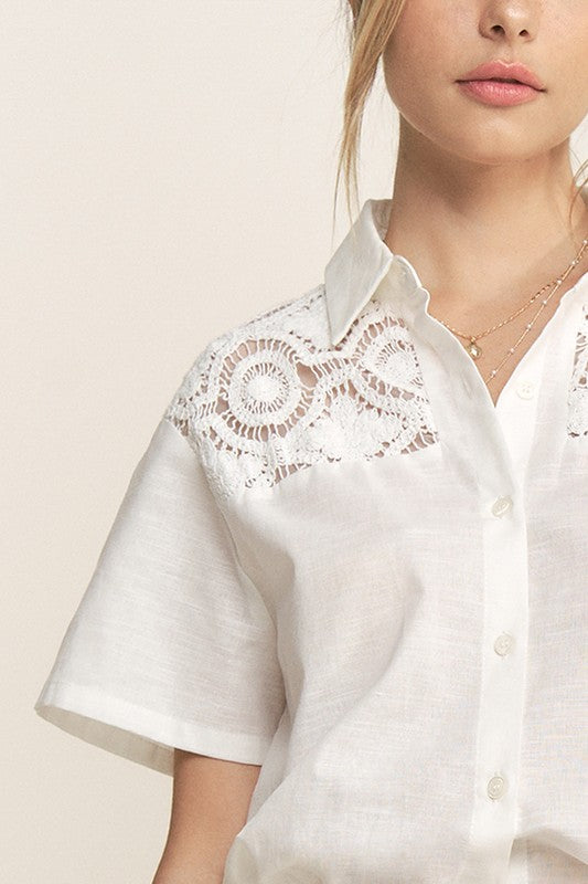 Embrace breezy comfort with this playful linen blend top featuring a relaxed collar and short sleeves. Delight in the intricate crochet shoulder details layered over delicate tulle, adding a whimsical touch to your look. The full button-down front makes it easy to wear, perfect for sunny days and casual adventures.