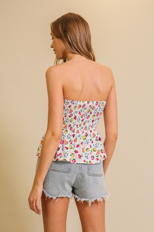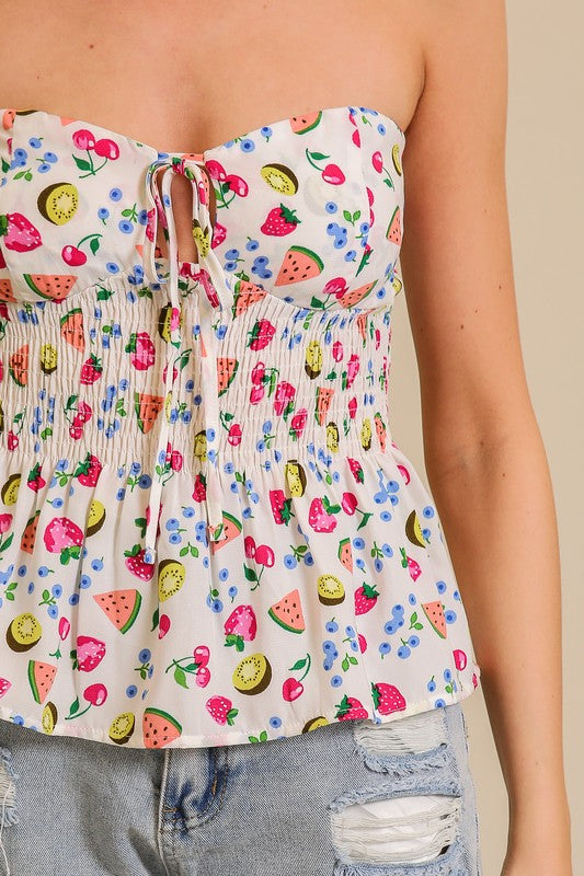 Sweeten up your look with this playful and flirty strapless top! Featuring a vibrant all-over fruit print with strawberries, cherries, kiwi, watermelon, and blueberries, this lightweight woven top is perfect for sunny days. Designed with a flattering smocked waist for a comfortable fit and a fun peplum hem that adds a flouncy touch. The front tie detail adds a charming finish to the sweetheart neckline.